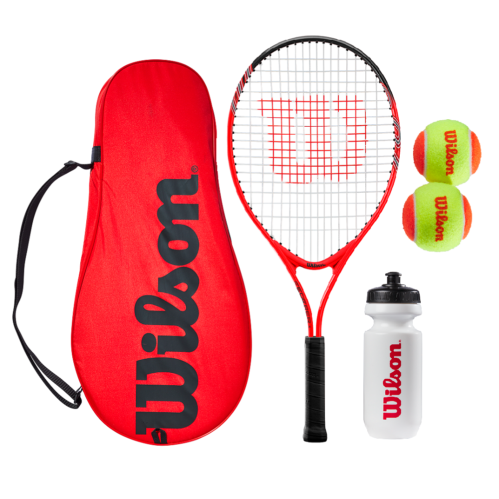 Set contains a Wilson Federer 25 tennis racket, 2 x stage 2 tennis balls, A water bottle and carry bag.