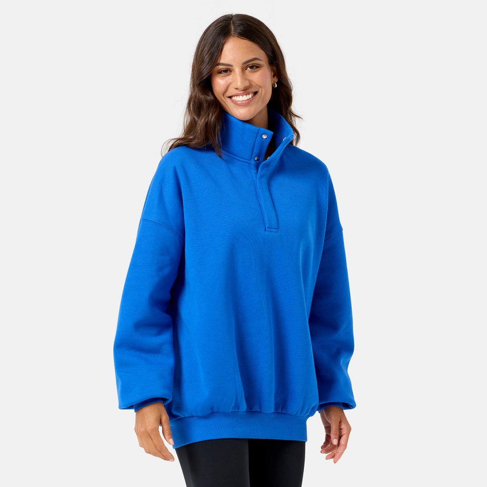 A relaxed, neutral, easy-to-wear style. With a fleece lining, a ribbed hem and a dropped shoulder design, this snap collar sweatshirt is effortlessly chic.
